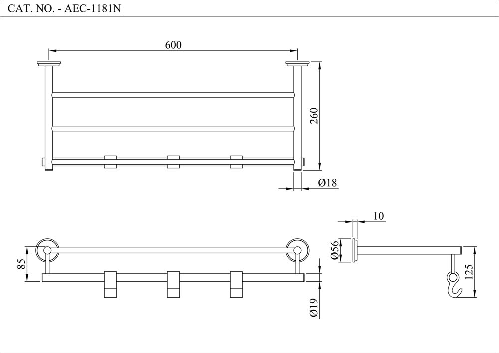 Towel Shelf 600 mm long with Lower Hangers, Stainless Steel