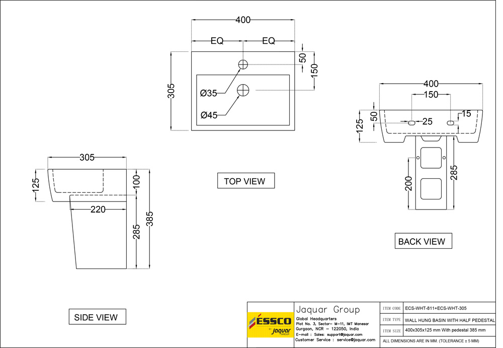 Wall Hung Basin With Fixing Accessories, Size: 400x305x125 mm