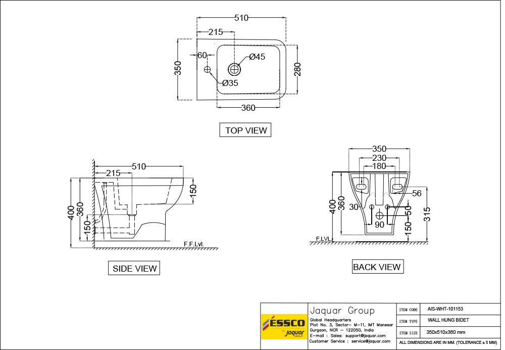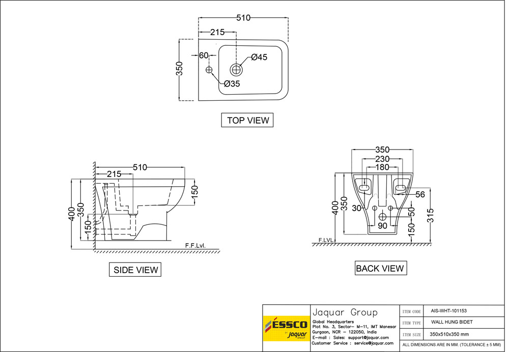 Wall Mounted Bidet With Fixing Accessories, Size: 350x510x360 mm